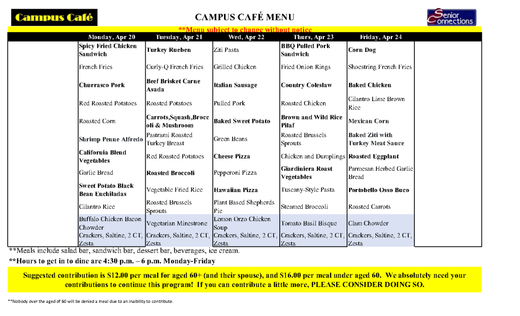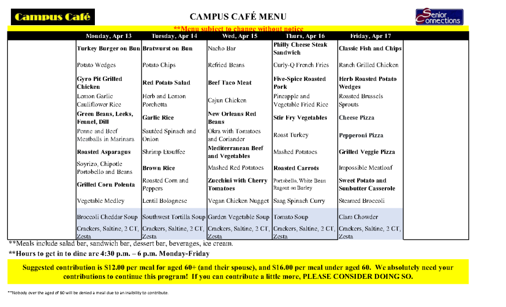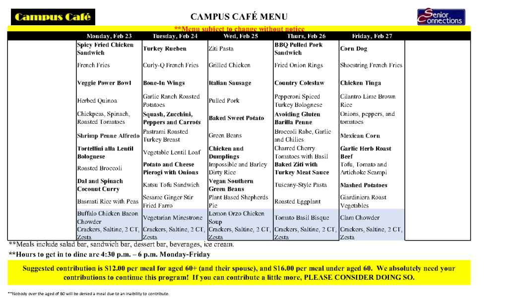 No reservations needed! Suggested contribution of $12.00 for those 60 years of age & older (spouse included) Requested contribution of $16.00 for those under 60 years of age.