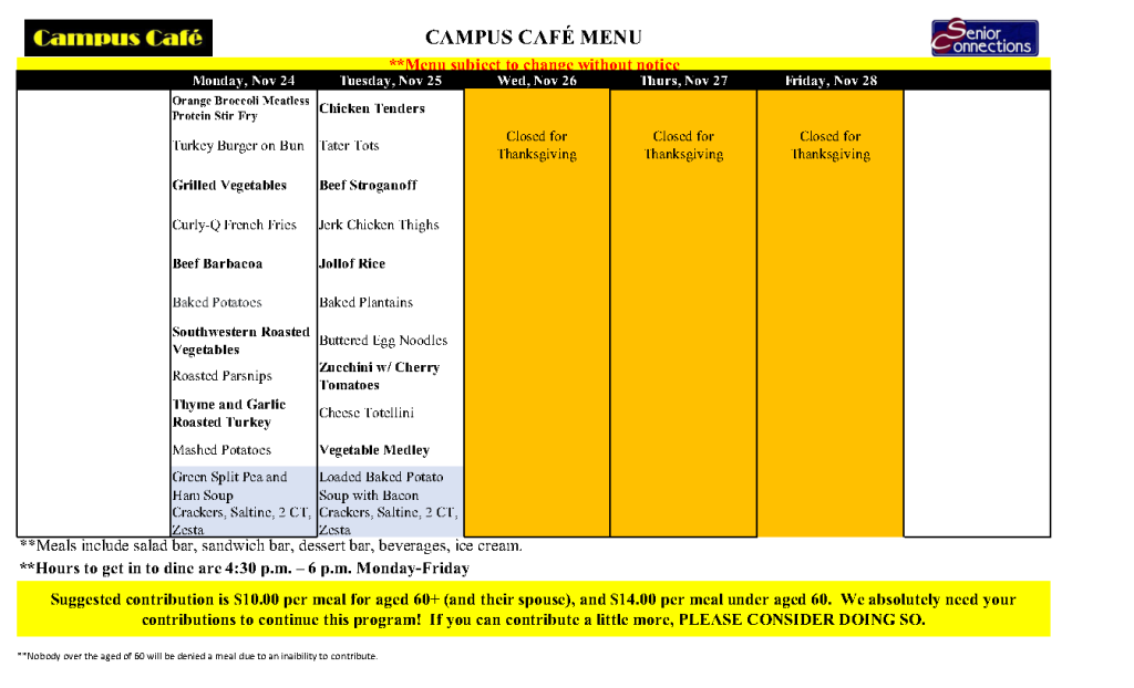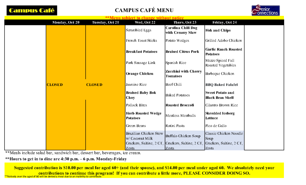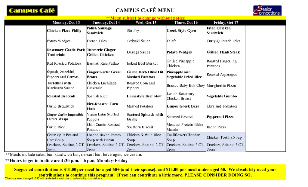 No reservations needed! Suggested contribution of $10.00 for those 60 years of age & older (spouse included) Suggested contribution of $14.00 for those under 60 years of age.