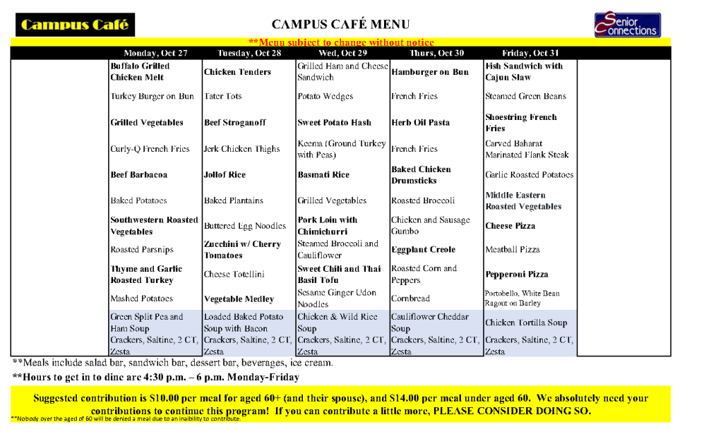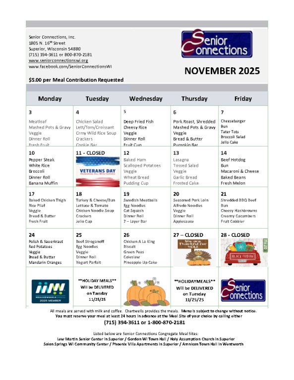 Please call Senior Connections at least 24 hours in advance to reserve a meal and to cancel, (715) 394-3611. $5.00 suggested donation per meal.