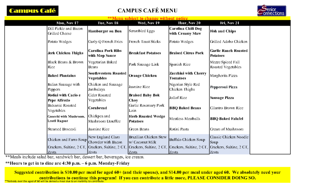 CONGREGATE 'DINE IN' MEALS--$5.00 SUGGESTED CONTRIBUTION PER MEAL.