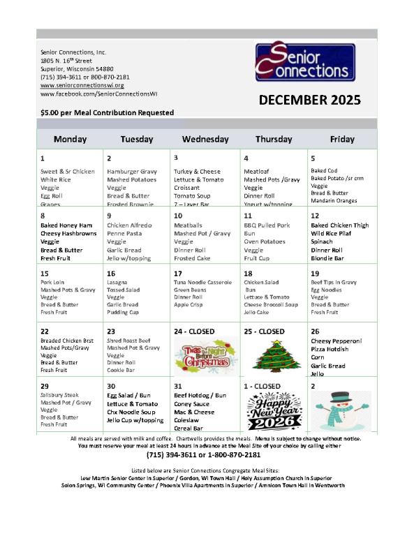 Please call Senior Connections at least 24 hours in advance to reserve a meal and to cancel a meal, (715) 394-3611.