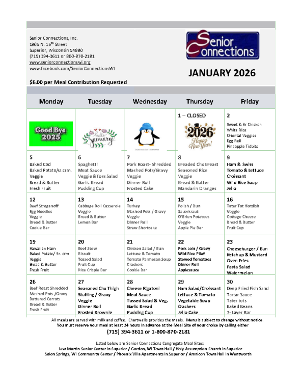 For more information on this program, please contact the Nutrition Program Director, Molly Andrews at Senior Connections (715) 394-3611 or (800) 870-2181, or via e-mail: nutritiondirector@seniorconnectionswi.org